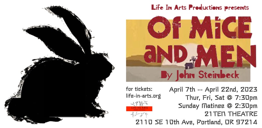 Life In Arts Productions is proud to announce that we are returning to the stage with a brand new production. After a long hiatus, the company will present Of Mice and Men by John Steinbeck, opening on April 7th, 2023 at 21TEN Theatre in Portland, Oregon. A modern American classic of page, stage, and screen, Of Mice and Men offers a meaningful examination of friendship, of the ways people are labeled and discarded because of physical or intellectual differences, of the search for a little place called home, a dream which remains now — as it did when this story was first written — out of reach for those who struggle in this society.